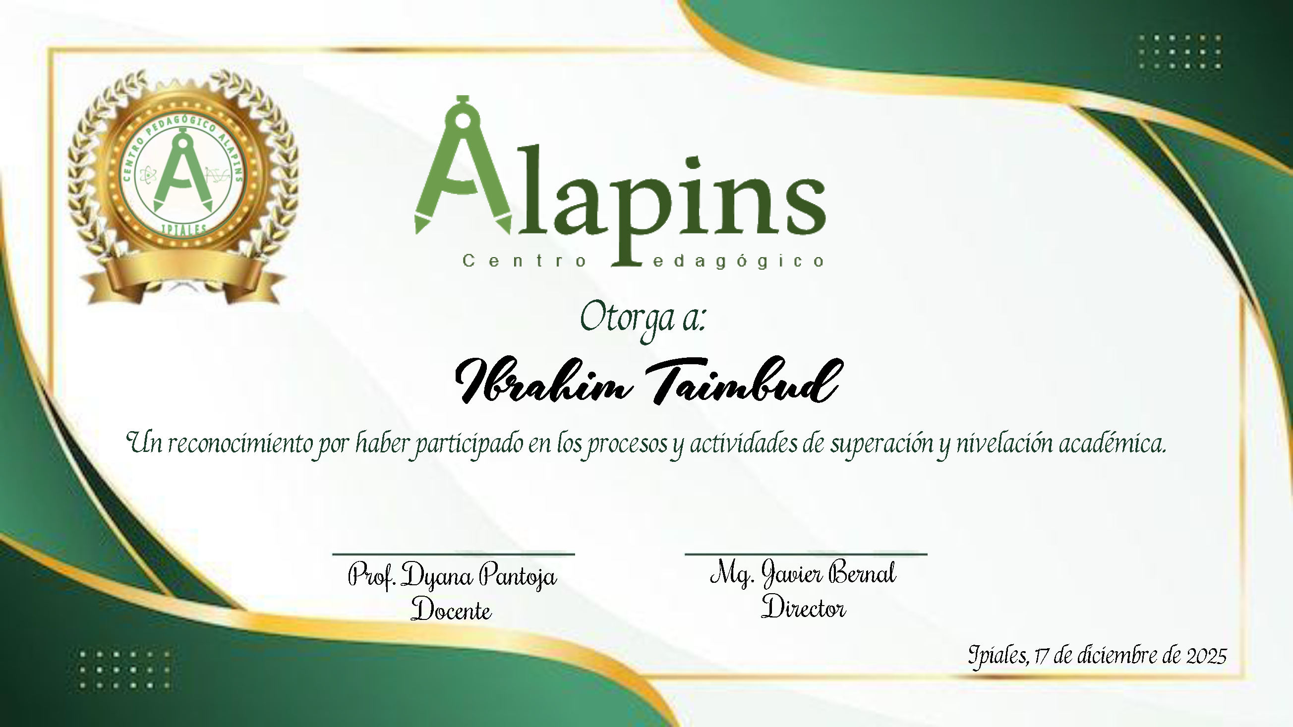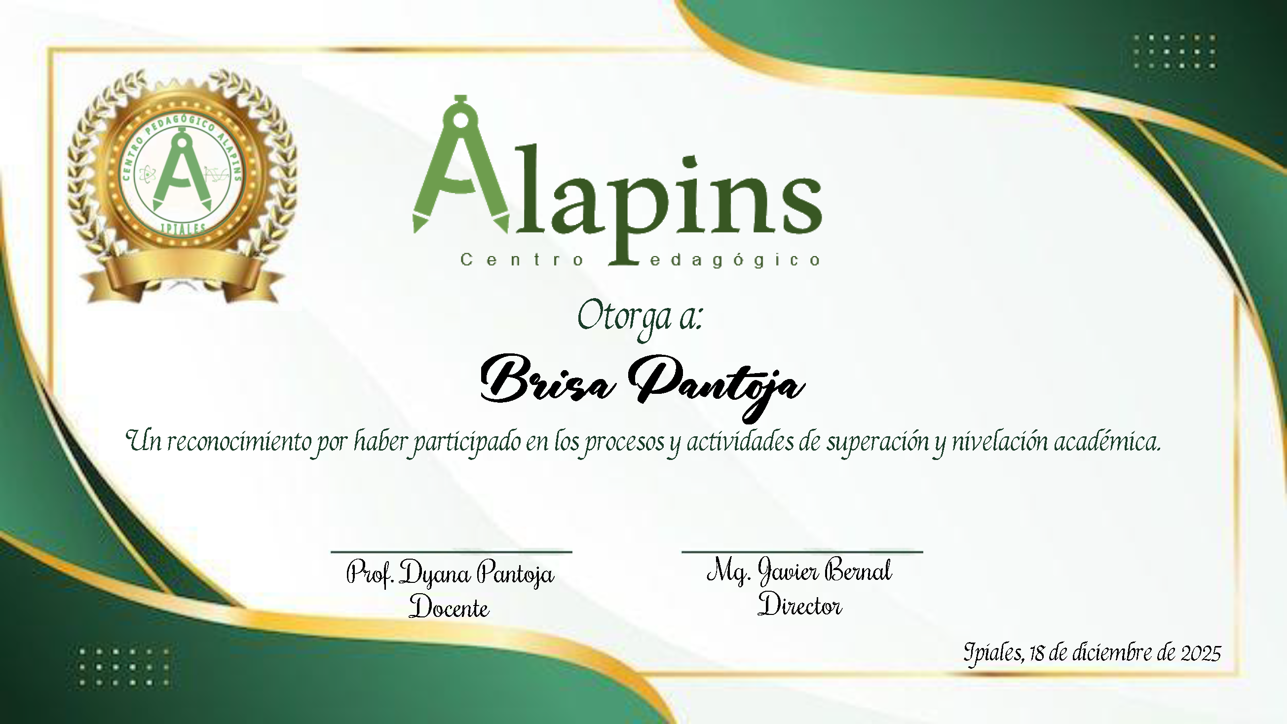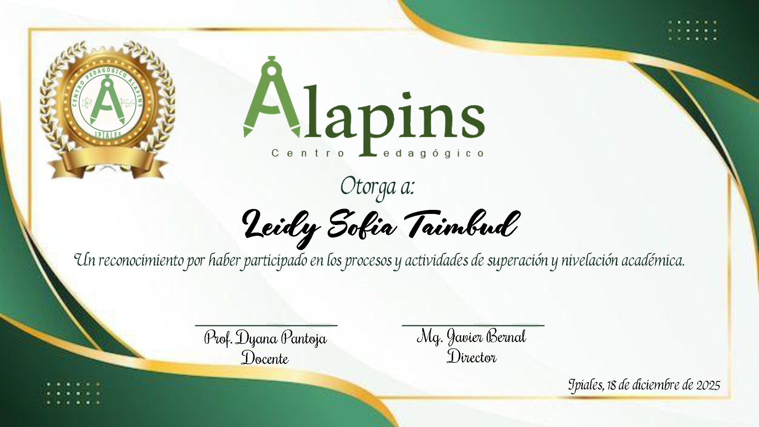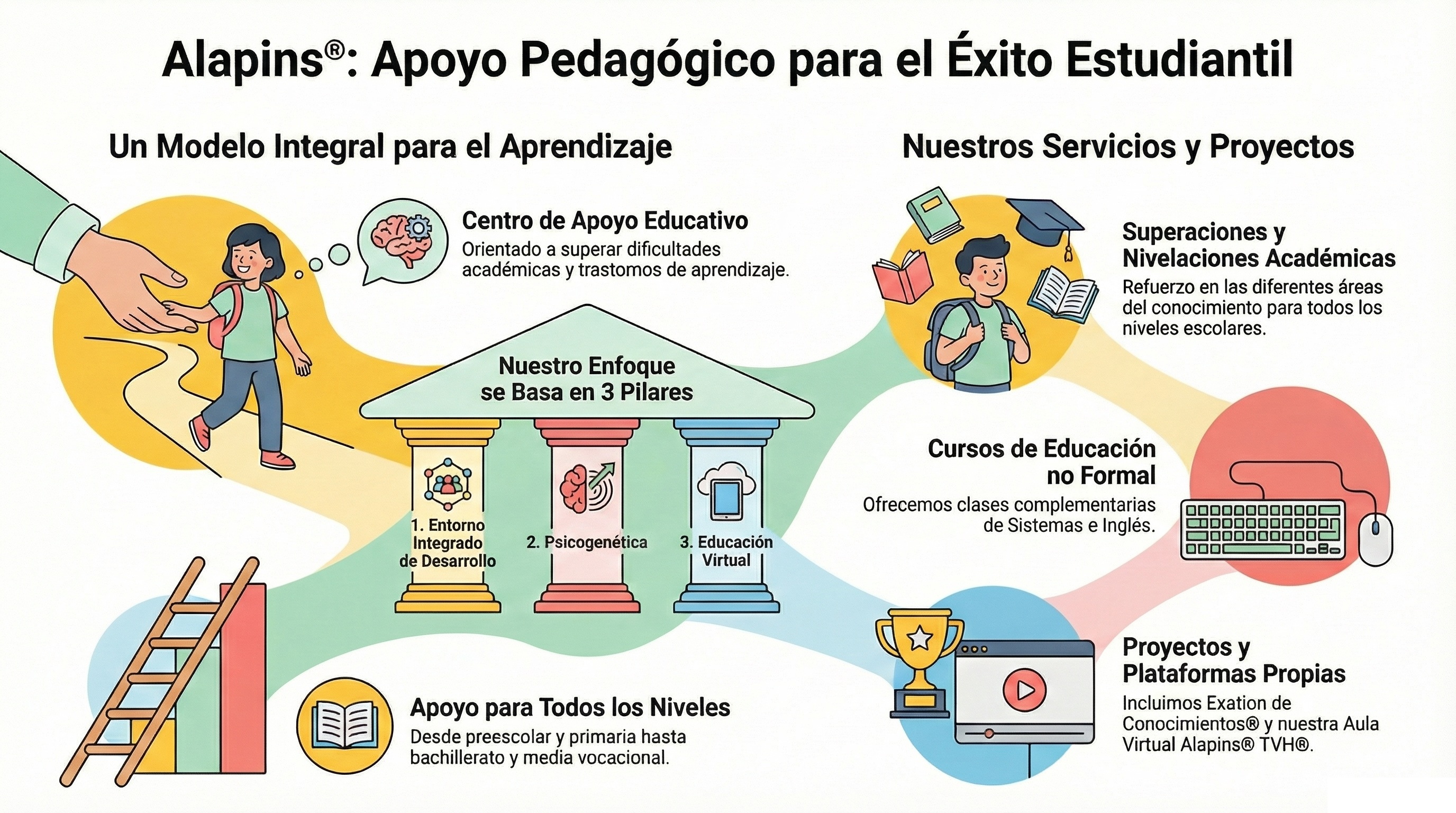 Alapins® Centro Pedagógico, es un centro educativo de carácter privado, que esta orientado a la superación y nivelación de dificultades académicas y trastornos de aprendizaje; basándonos según lo que exige el sistema educativo colombiano y las adaptaciones del cumplimiento en el marco legal de los estándares básicos de competencias (MEN), realizando un seguimiento y acompañamiento pedagógico al estudiante de los niveles de preescolar, básica primaria, bachillerato y media vocacional, en las diferentes áreas del conocimiento, partiendo exclusivamente de tres matrices fundamentales como son su entorno integrado de desarrollo (EID), su psicogenética y la educación virtual, convencidos que en armonía de su comportamiento y conducta podemos avanzar hacia la simulación y transposición didáctica, clave para orientar al logro, incentivar la comunicación asertiva, desarrollar metacognición y desde la autonomía y liderazgo, volver a involucrar al estudiante, hacia la construcción de su propio conocimiento y el camino de la excelencia y calidad educativa.