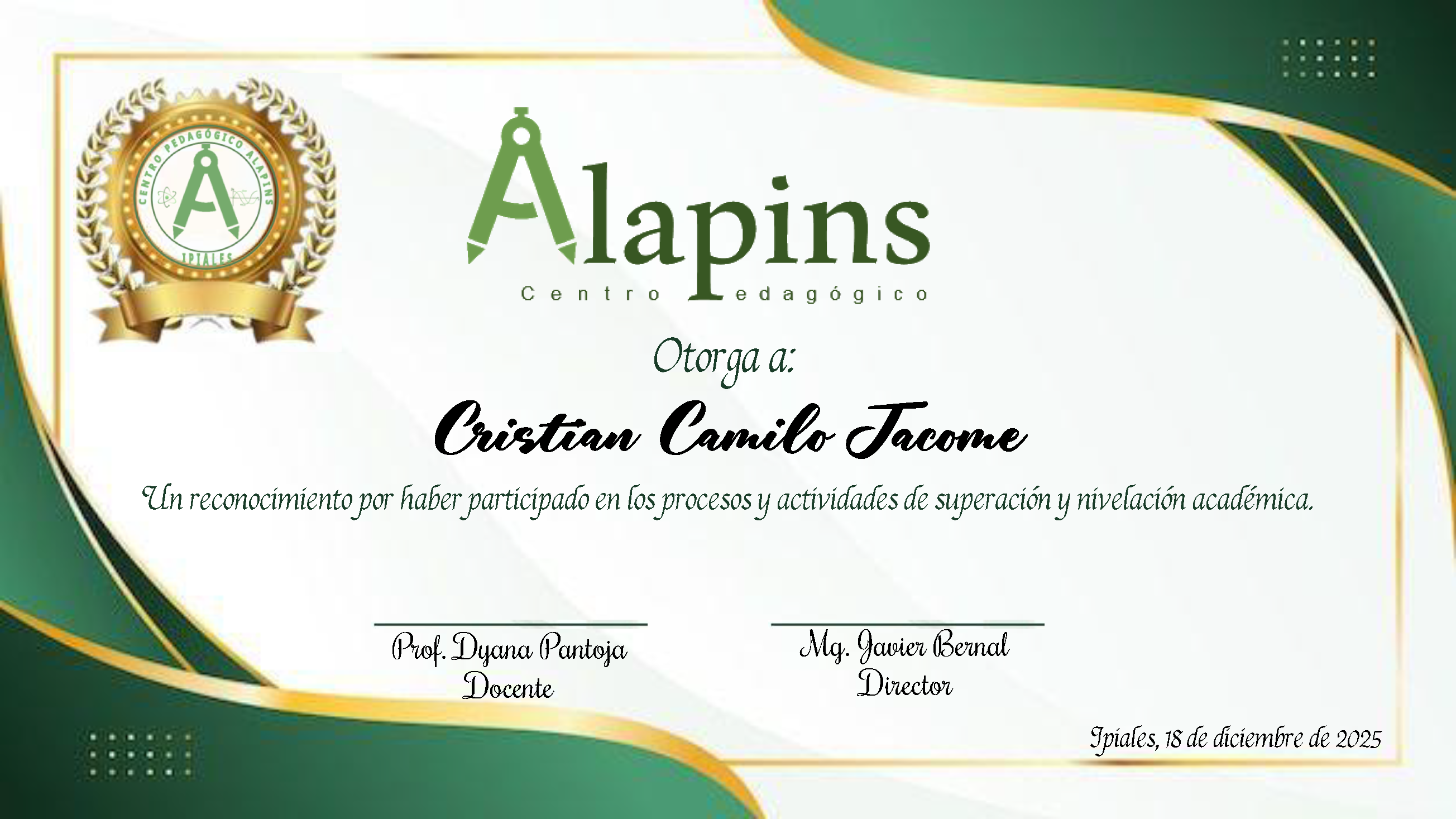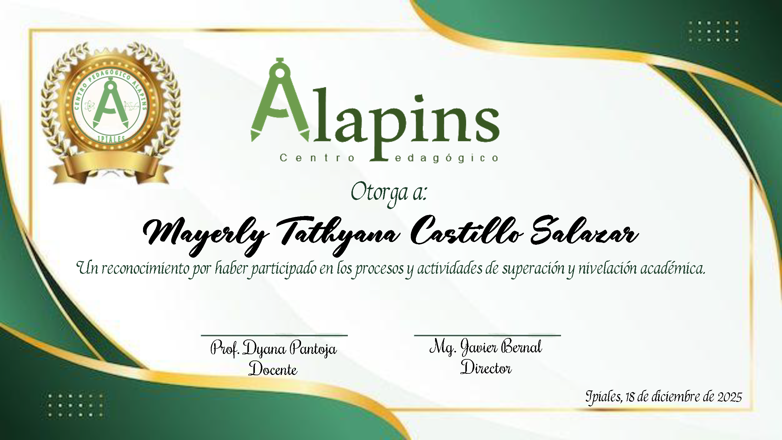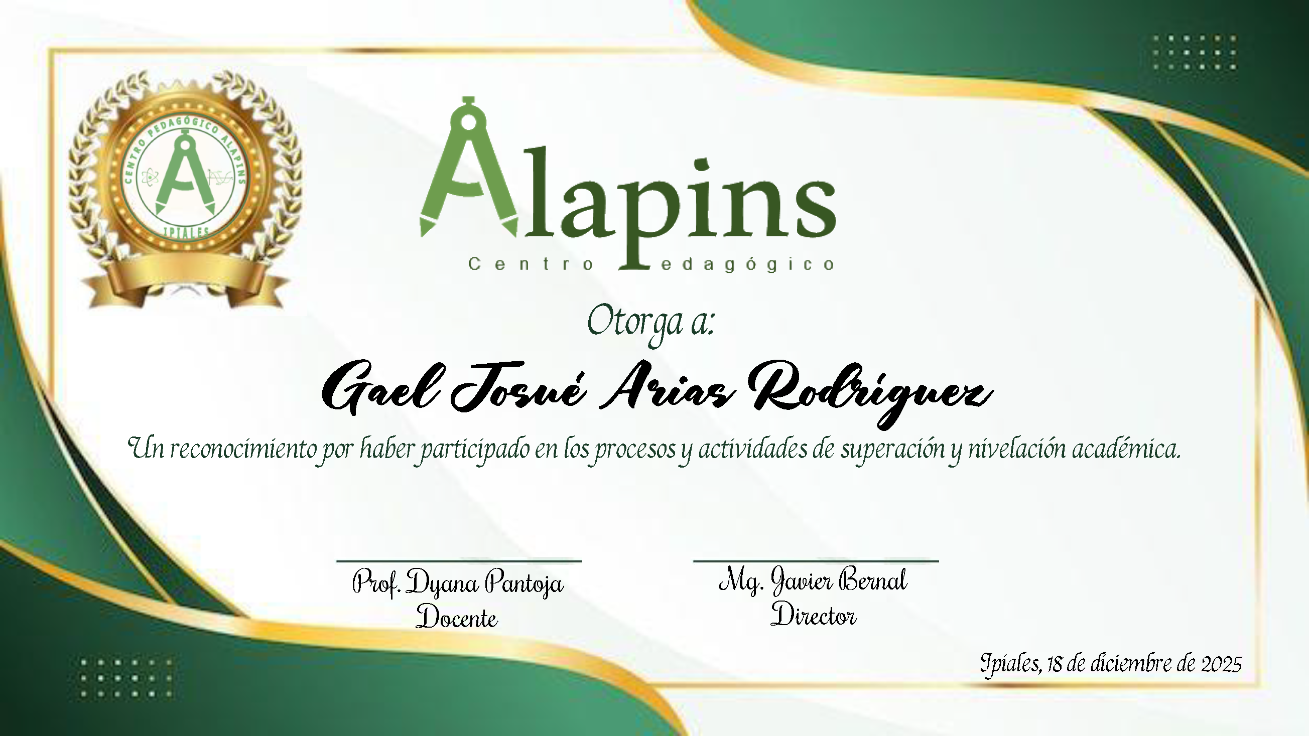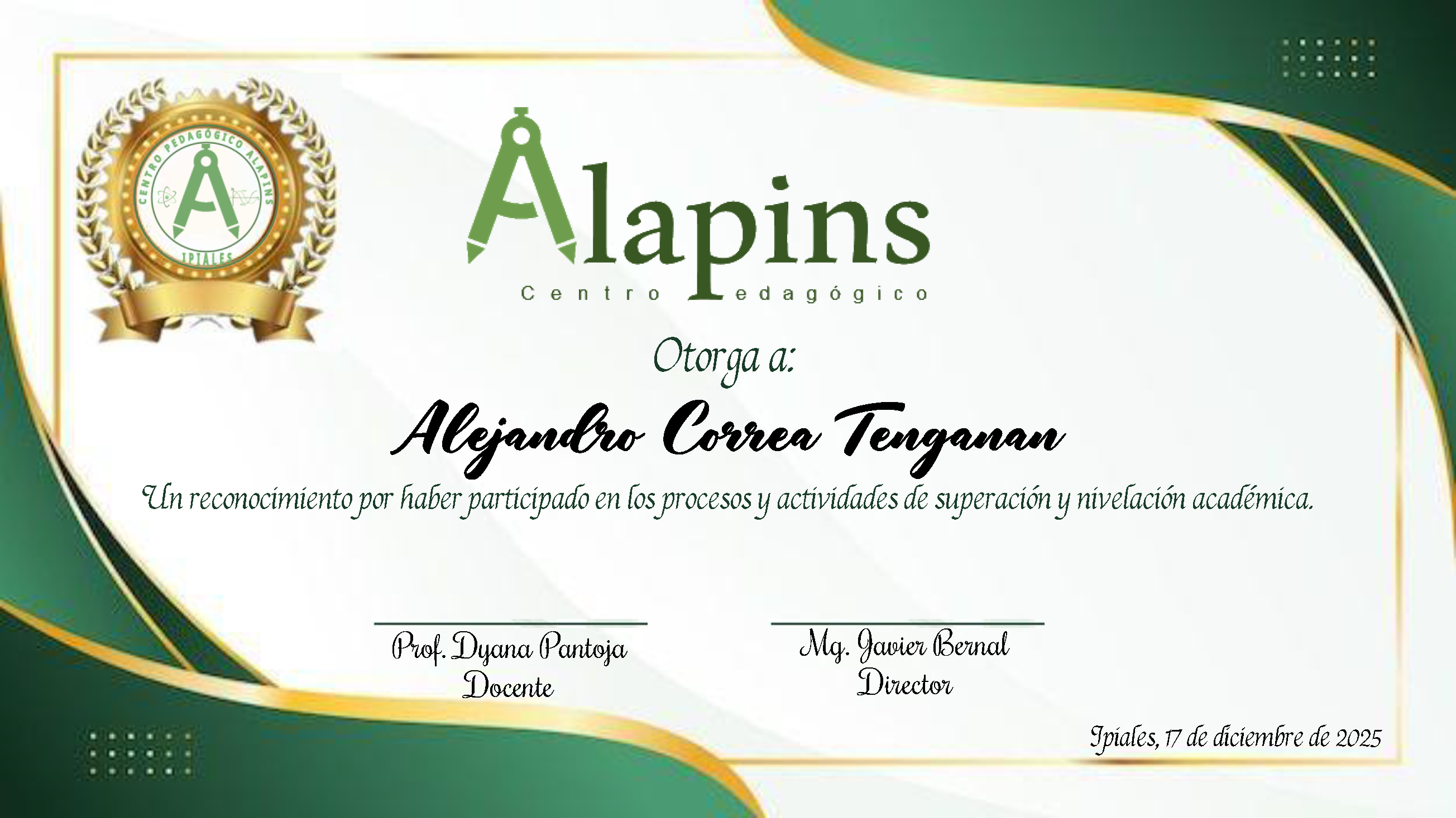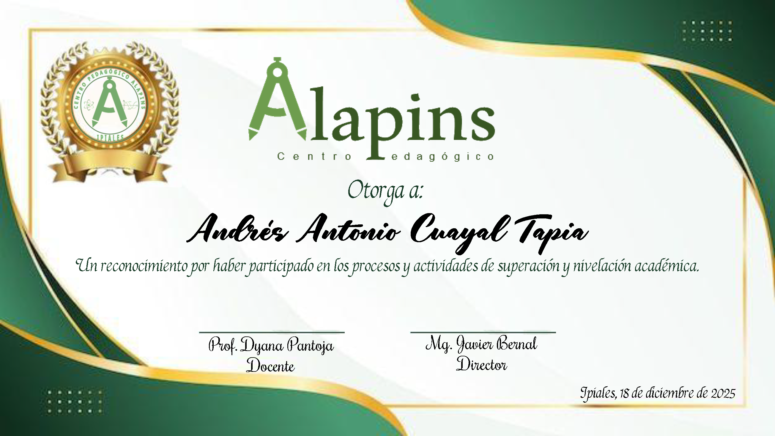 Alapins® Centro Pedagógico, es un centro educativo de carácter privado, que esta orientado a la superación y nivelación de dificultades académicas y trastornos de aprendizaje; basándonos según lo que exige el sistema educativo colombiano y las adaptaciones del cumplimiento en el marco legal de los estándares básicos de competencias (MEN), realizando un seguimiento y acompañamiento pedagógico al estudiante de los niveles de preescolar, básica primaria, bachillerato y media vocacional, en las diferentes áreas del conocimiento, partiendo exclusivamente de tres matrices fundamentales como son su entorno integrado de desarrollo (EID), su psicogenética y la educación virtual, convencidos que en armonía de su comportamiento y conducta podemos avanzar hacia la simulación y transposición didáctica, clave para orientar al logro, incentivar la comunicación asertiva, desarrollar metacognición y desde la autonomía y liderazgo, volver a involucrar al estudiante, hacia la construcción de su propio conocimiento y el camino de la excelencia y calidad educativa.
